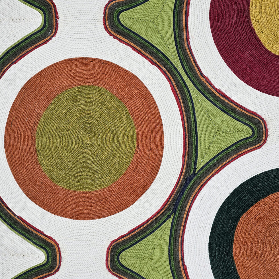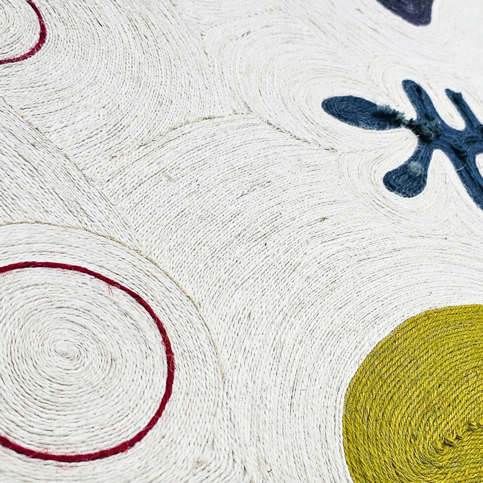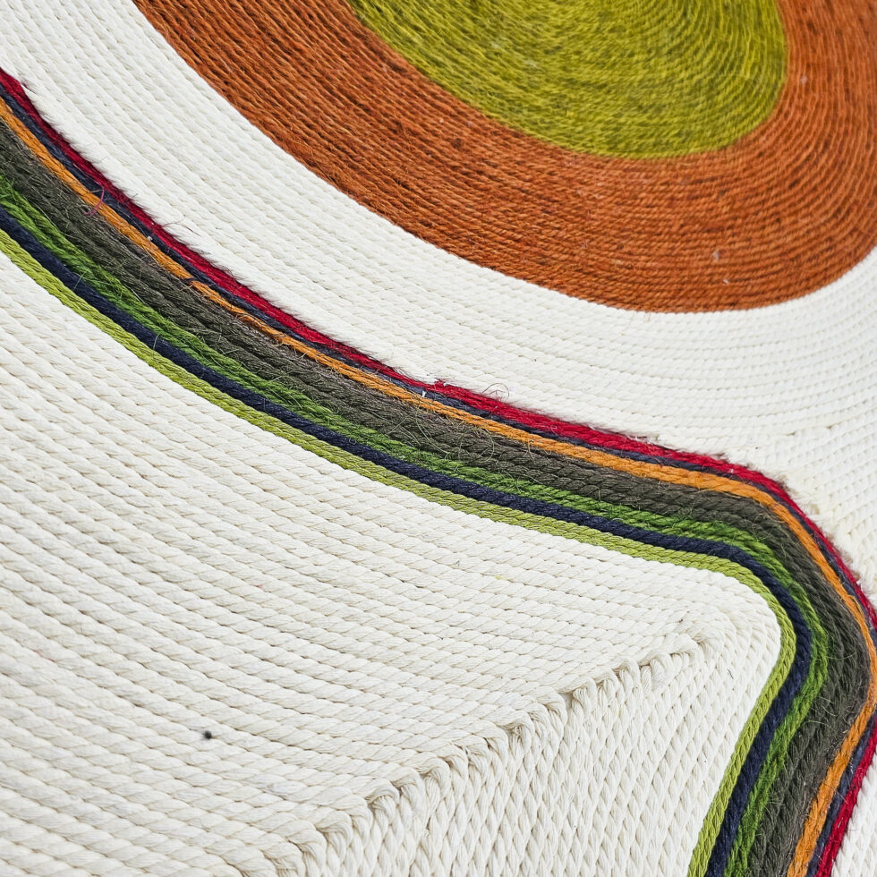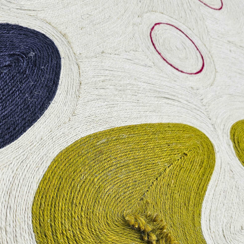 Playing with the movements of ropes of different thicknesses and colours, she expresses her passion for the beauty of an imaginary world, from Latin America to Africa, via India.