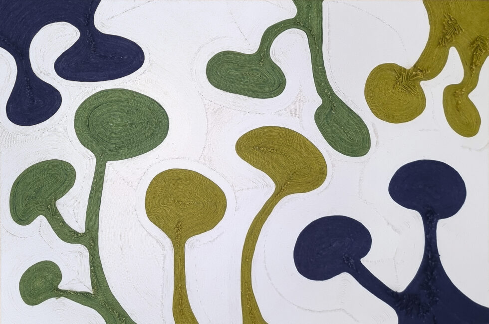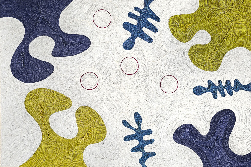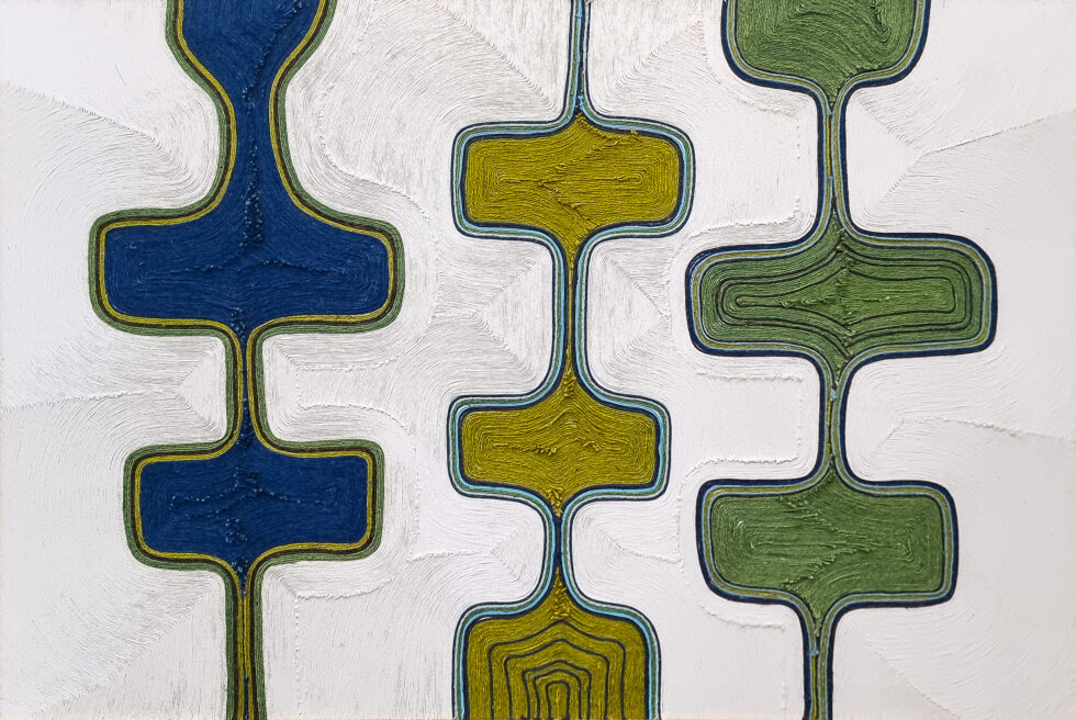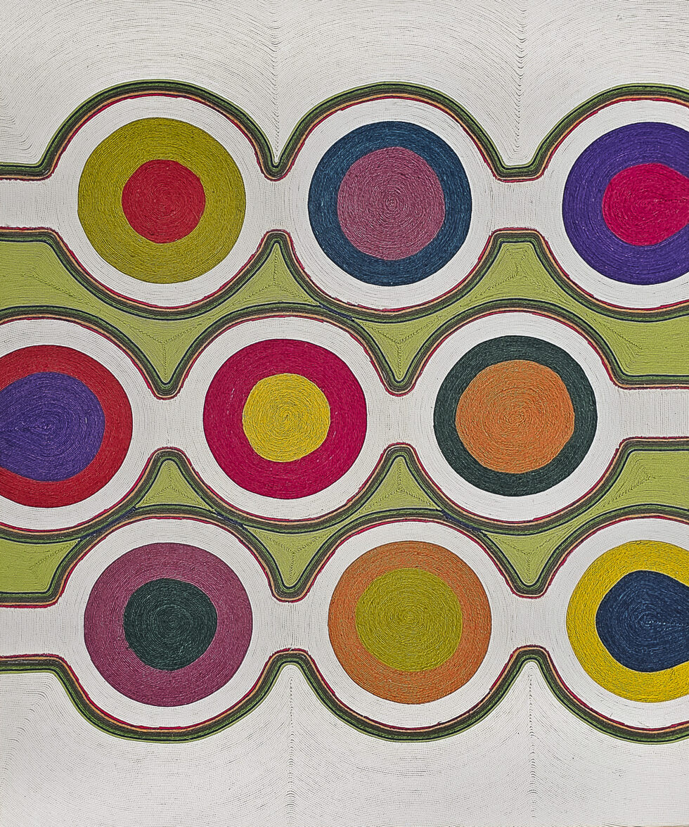 Playing with the movements of ropes of different thicknesses and colours, she expresses her passion for the beauty of an imaginary world, from Latin America to Africa, via India.